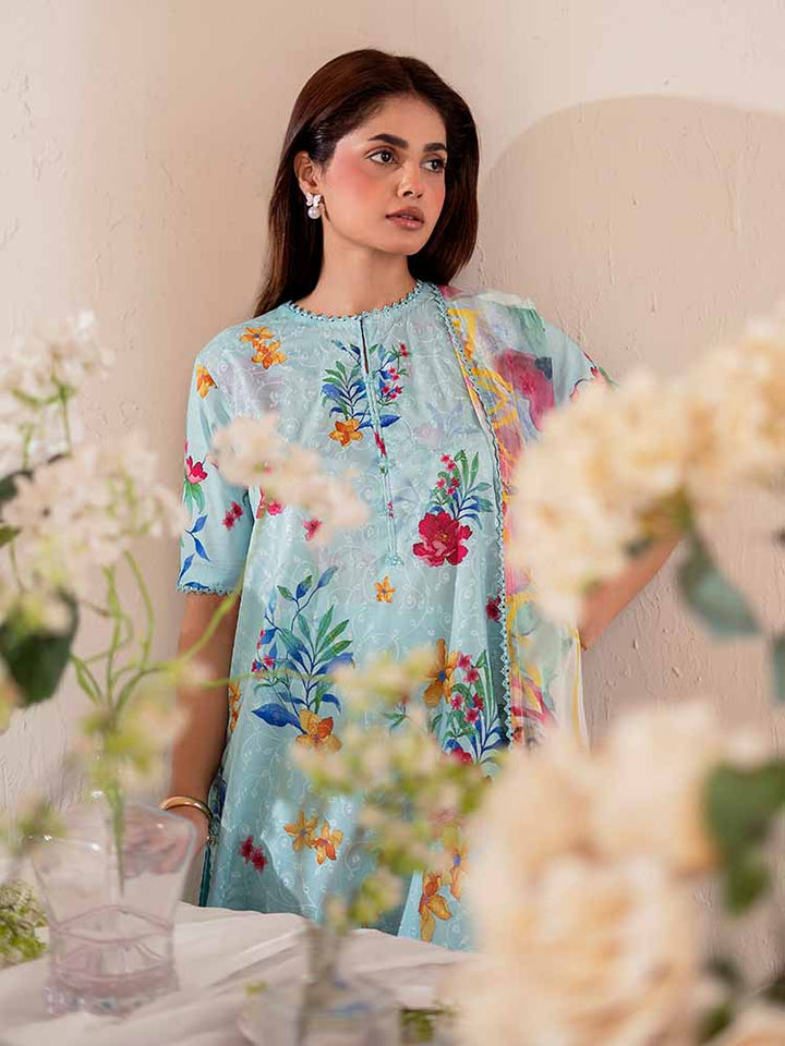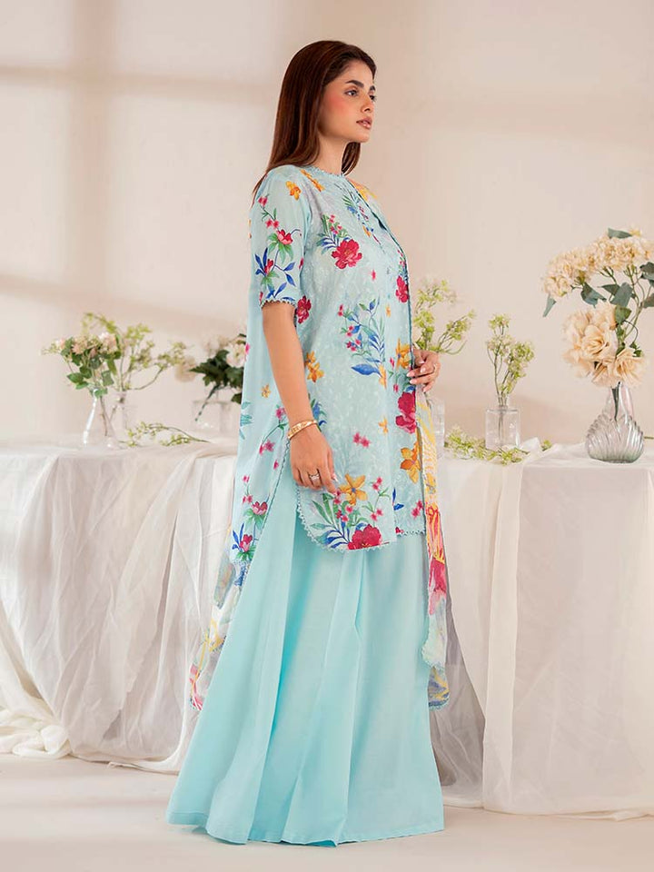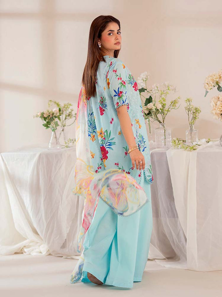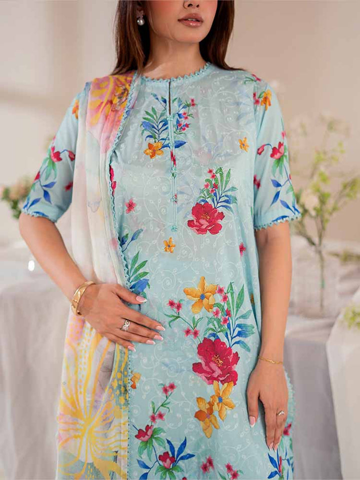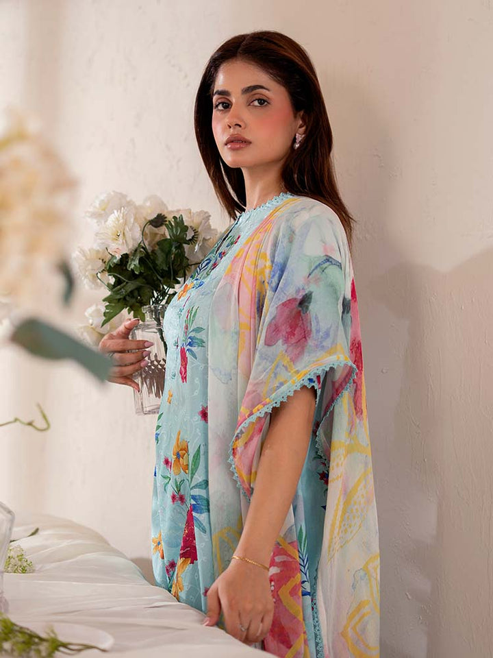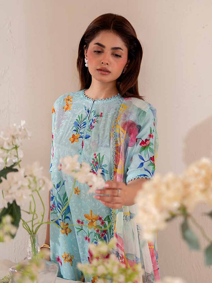 The stunning Digital Printed Lawn Shirt features intricate Chikankari embroidery on the front, creating a beautiful, textured focal point. The back and sleeves continue the vibrant, high-definition digital print, ensuring a cohesive and eye-catching look from every angle.