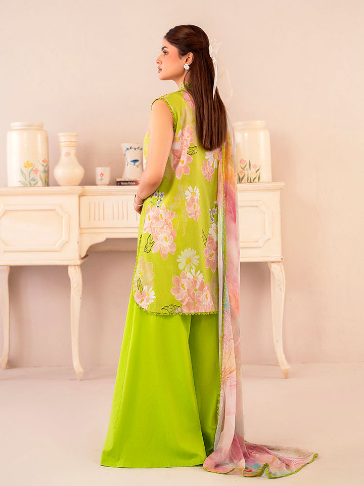 The stunning Digital Printed Lawn Shirt features intricate Chikankari embroidery on the front, creating a beautiful, textured focal point. The back and sleeves continue the vibrant, high-definition digital print, ensuring a cohesive and eye-catching look from every angle.