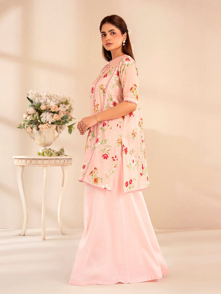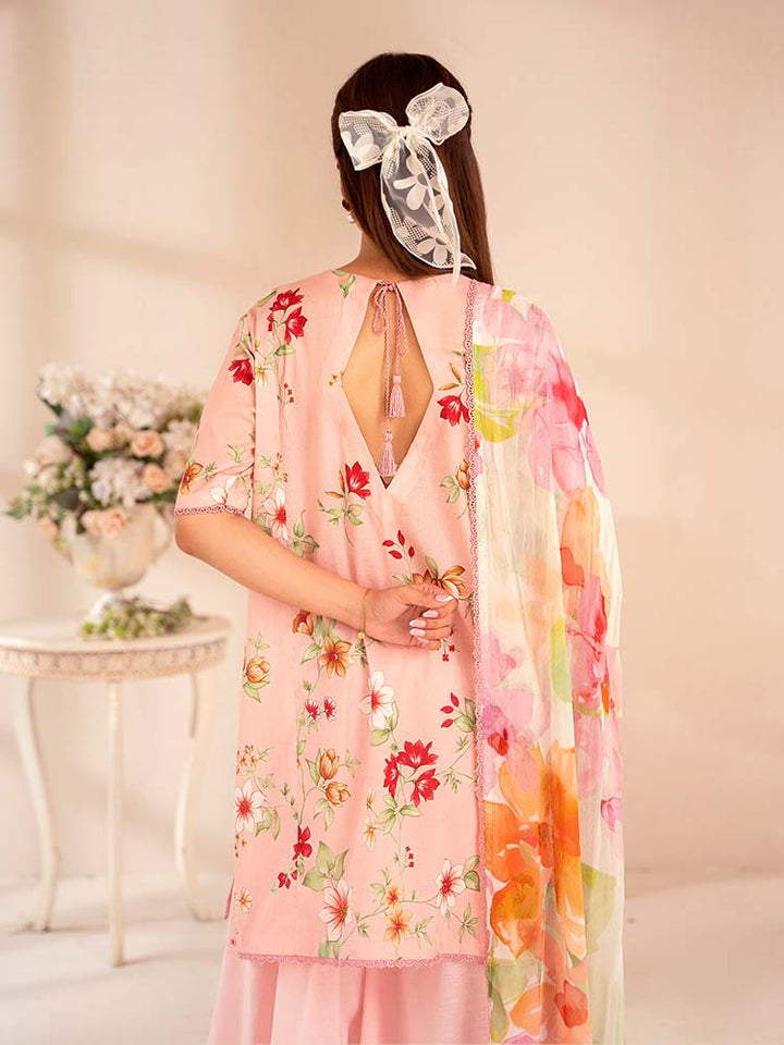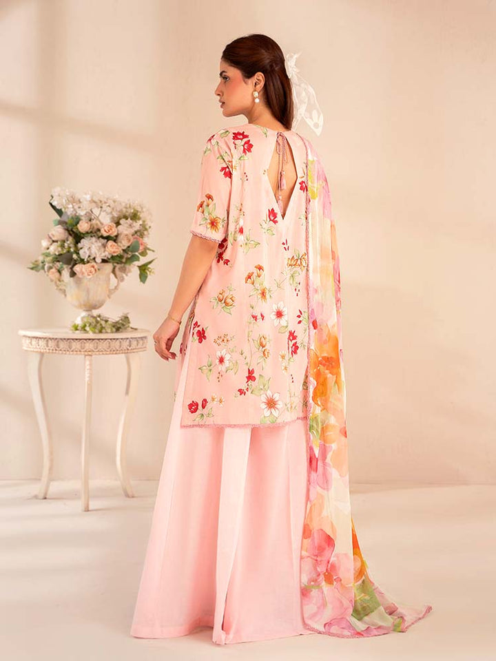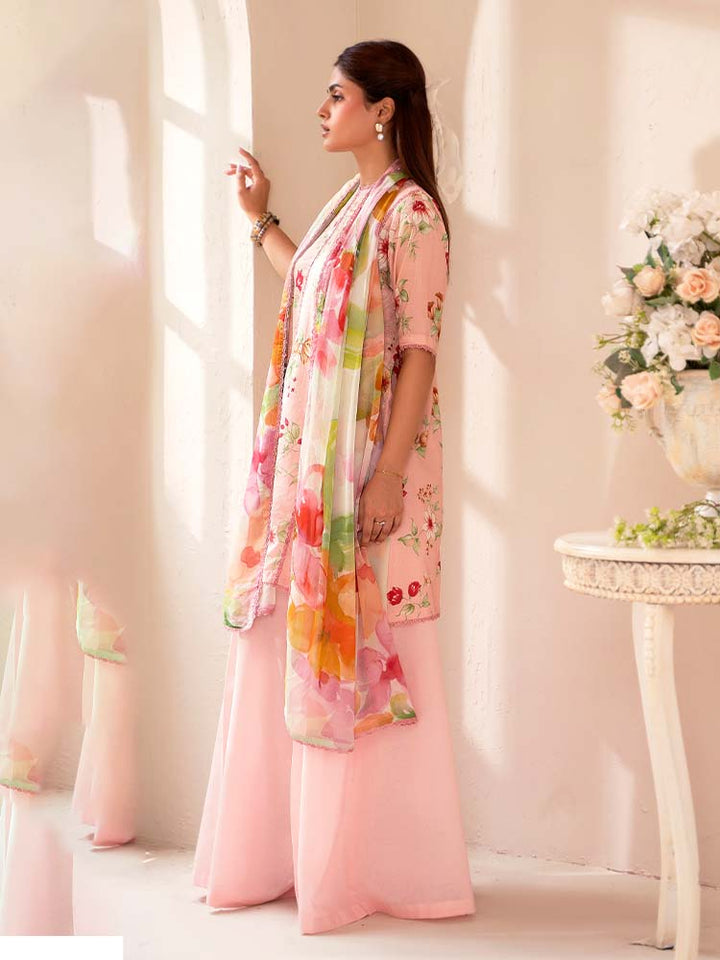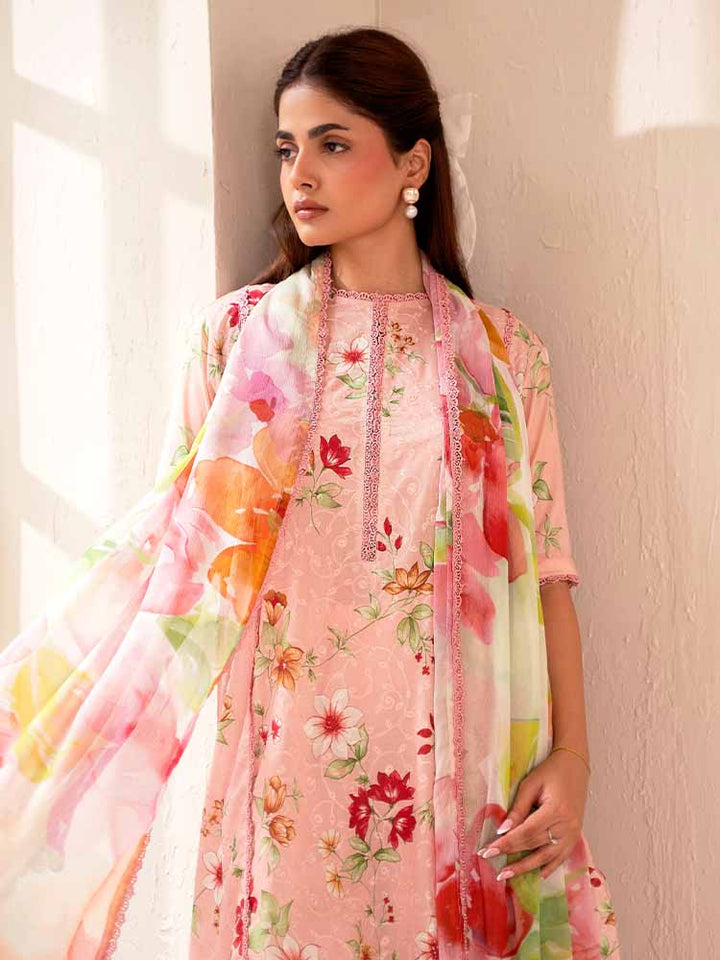 The stunning Digital Printed Lawn Shirt features intricate Chikankari embroidery on the front, creating a beautiful, textured focal point. The back and sleeves continue the vibrant, high-definition digital print, ensuring a cohesive and eye-catching look from every angle.