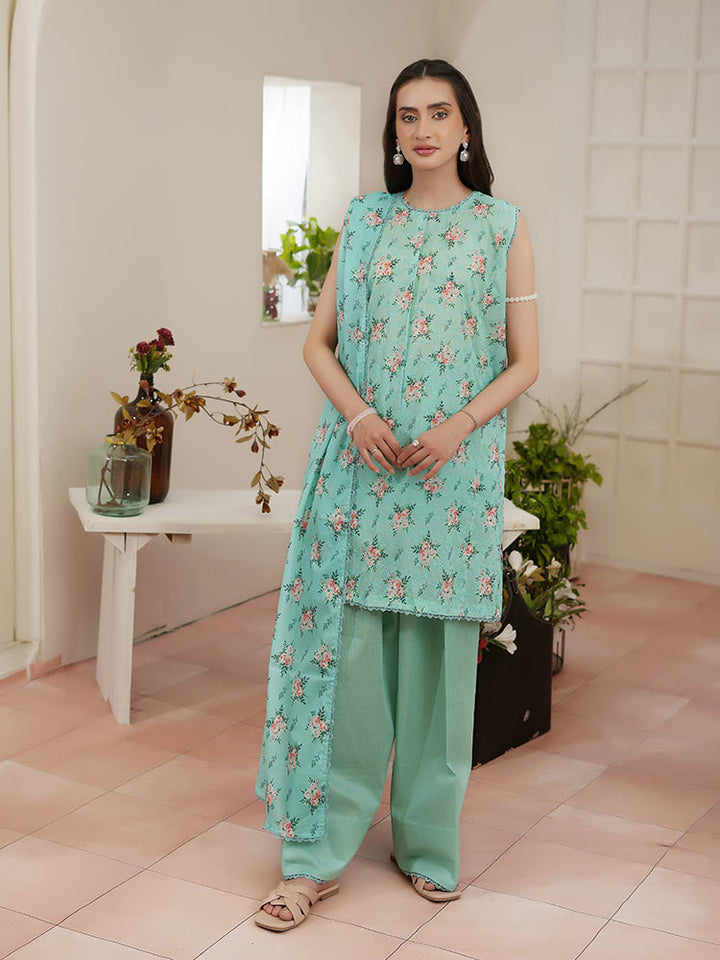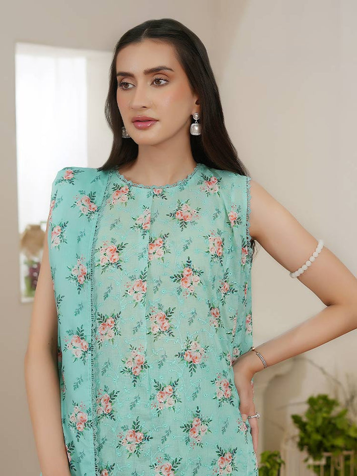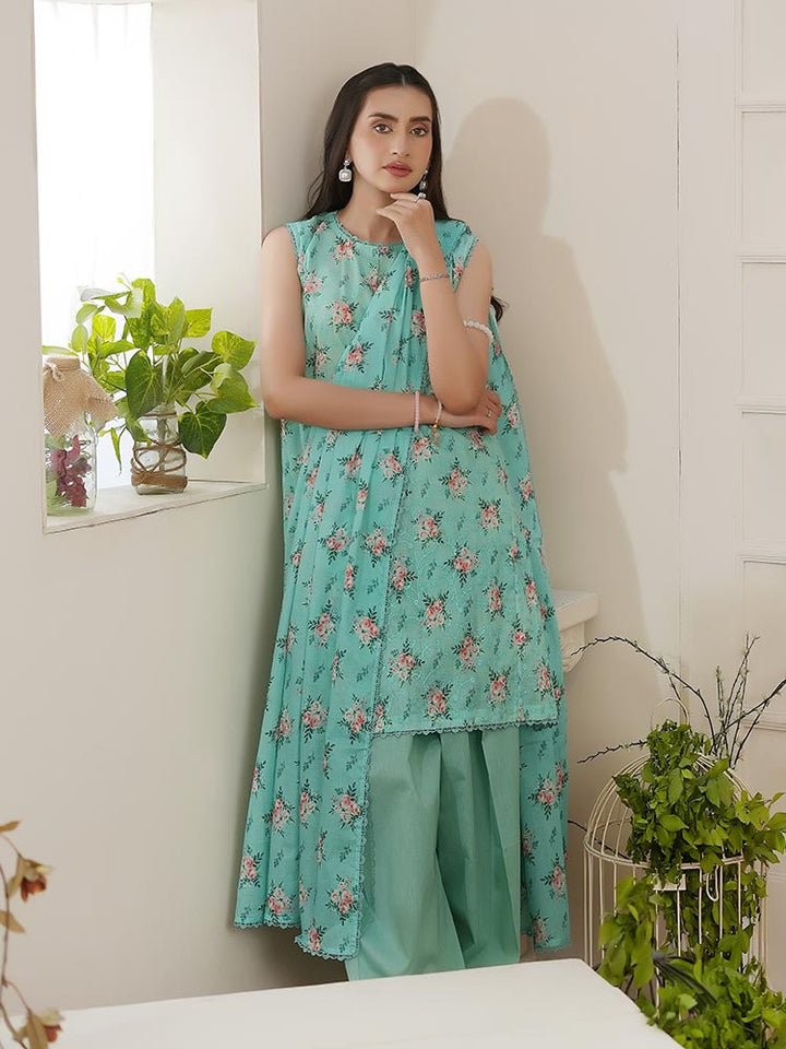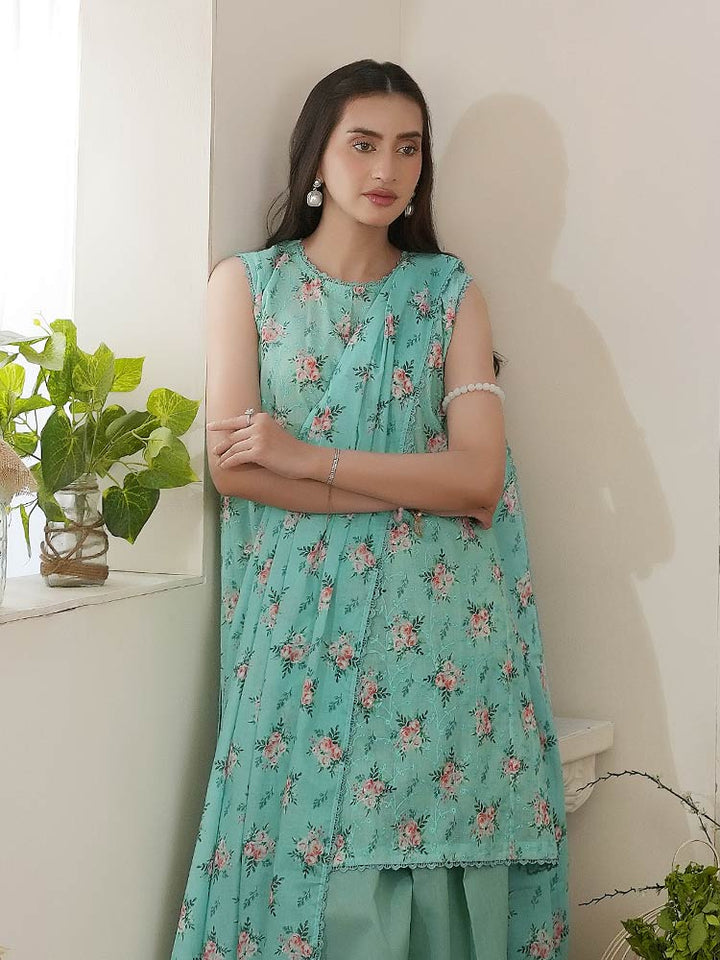 Enhance your wardrobe with the NIRA 3-Piece Unstitched Digital Printed Lawn Suit, a perfect blend of comfort and sophistication. This exquisite suit set includes a digital printed lawn shirt, dyed cambric cotton trousers, and a matching pure lawn dupatta, offering a flawless ethnic look for any occasion.