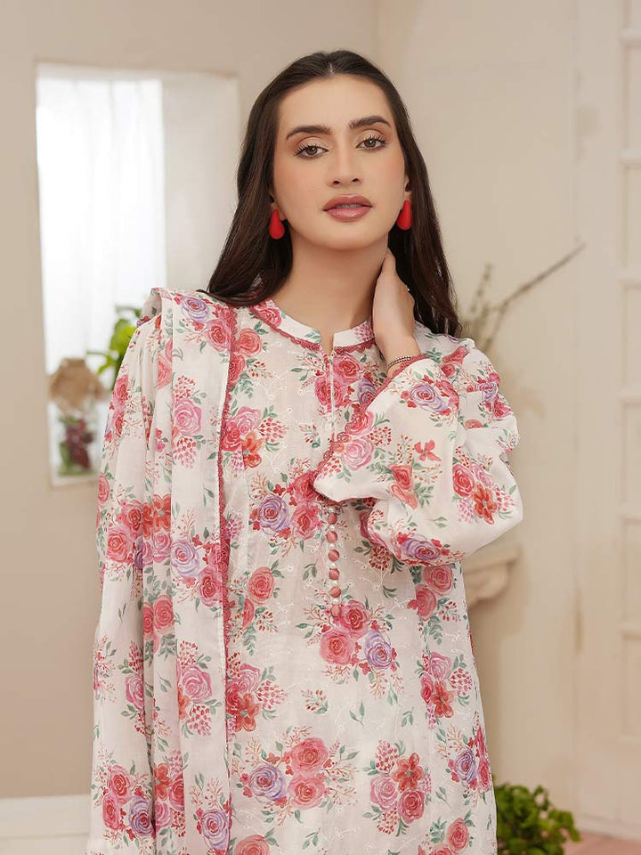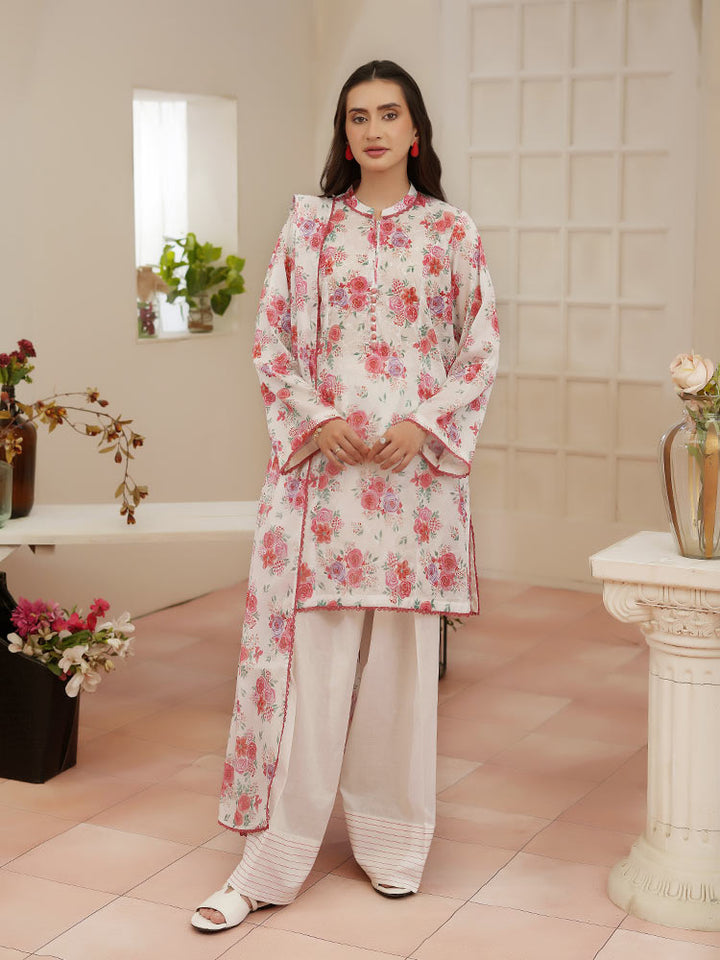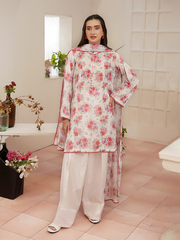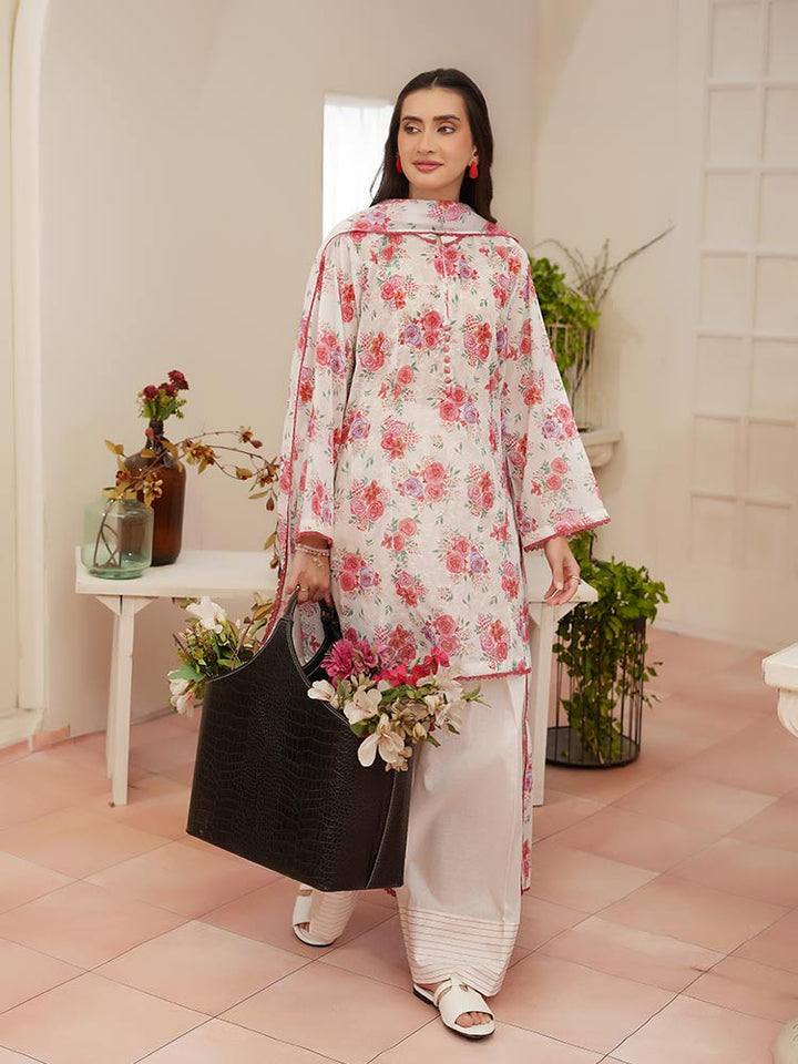 Enhance your wardrobe with the NIRA 3-Piece Unstitched Digital Printed Lawn Suit, a perfect blend of comfort and sophistication. This exquisite suit set includes a digital printed lawn shirt, dyed cambric cotton trousers, and a matching pure lawn dupatta, offering a flawless ethnic look for any occasion.