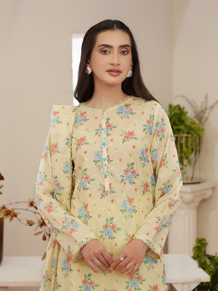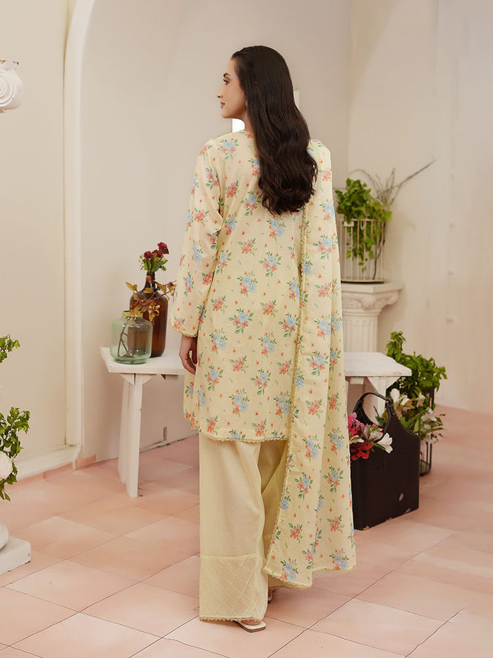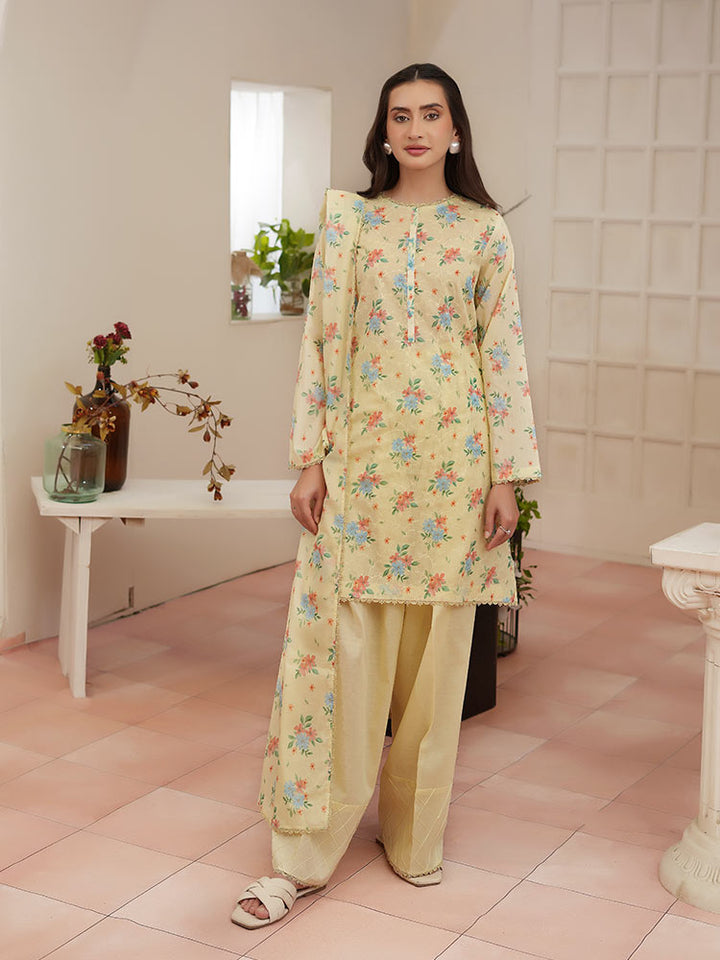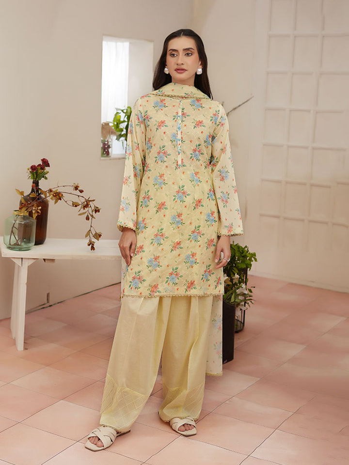 Enhance your wardrobe with the NIRA 3-Piece Unstitched Digital Printed Lawn Suit, a perfect blend of comfort and sophistication. This exquisite suit set includes a digital printed lawn shirt, dyed cambric cotton trousers, and a matching pure lawn dupatta, offering a flawless ethnic look for any occasion.
