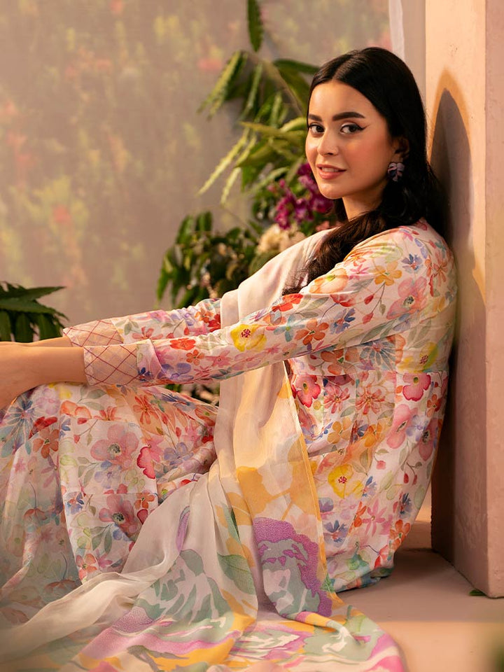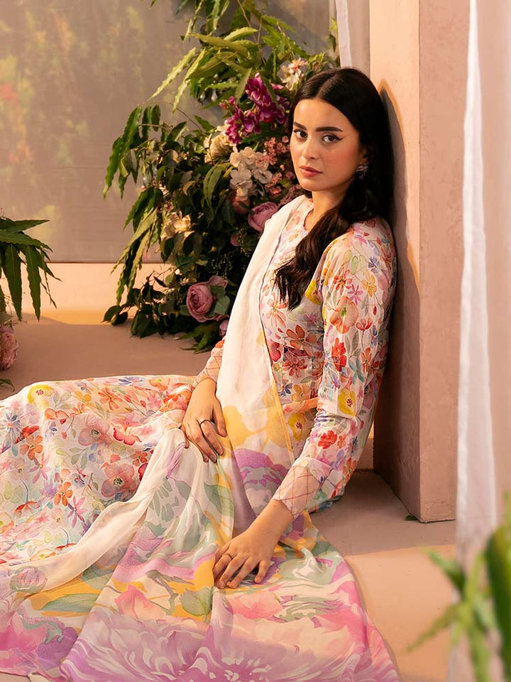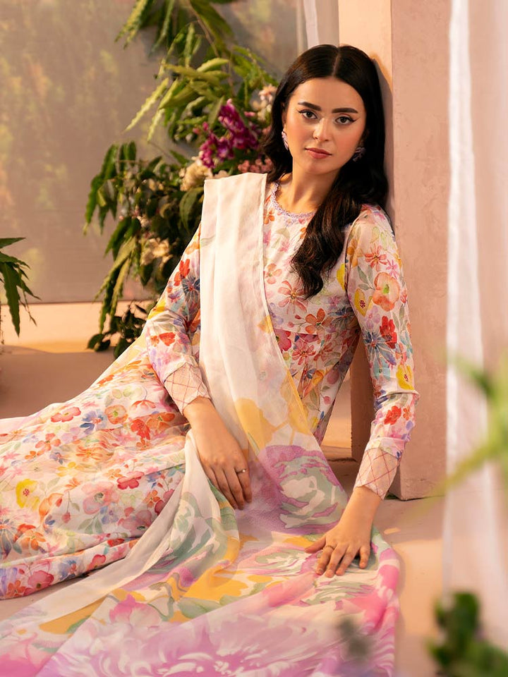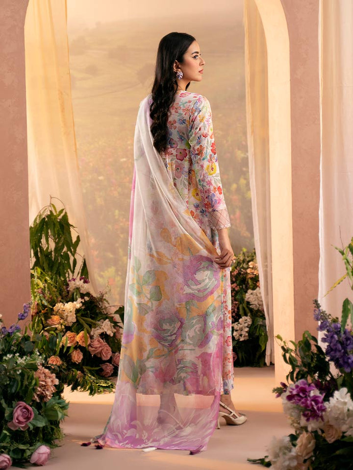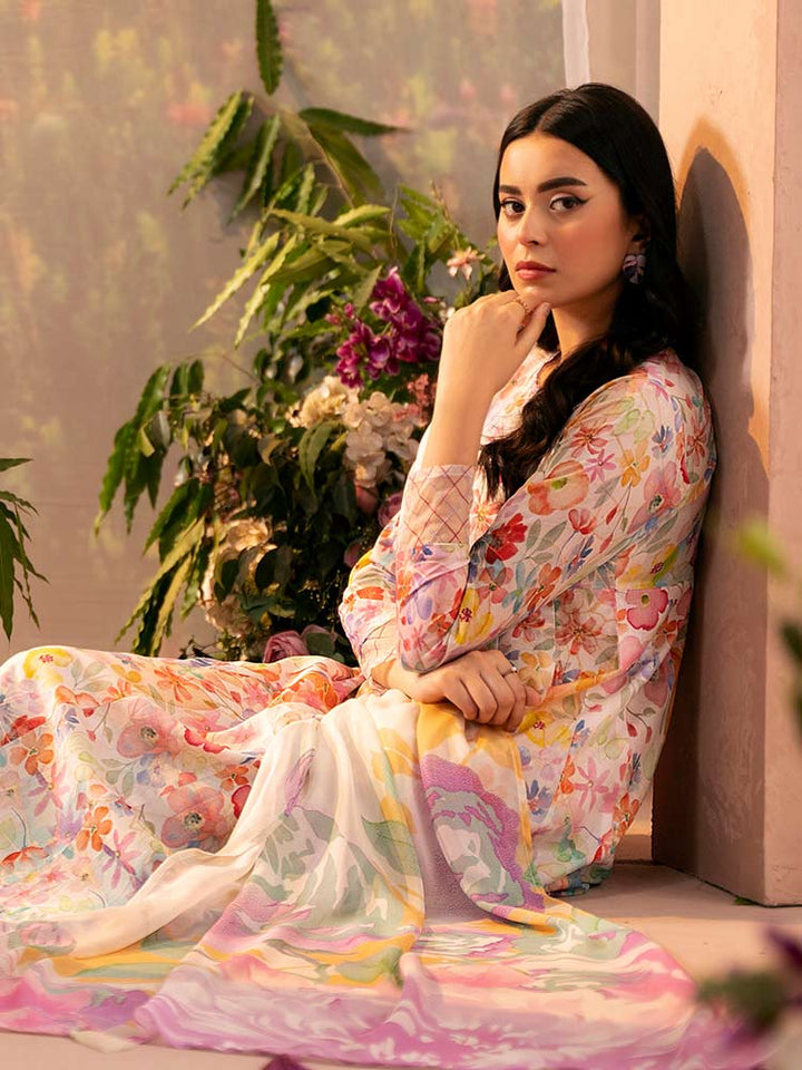 Add fresh floral charm to your wardrobe with PEACH POPPIES, a 3-piece unstitched lawn suit featuring a digital printed shirt (front, back & sleeves), dyed cambric trouser, and a flowy digital printed bamber chiffon dupatta. Perfect for summer casuals and light gatherings